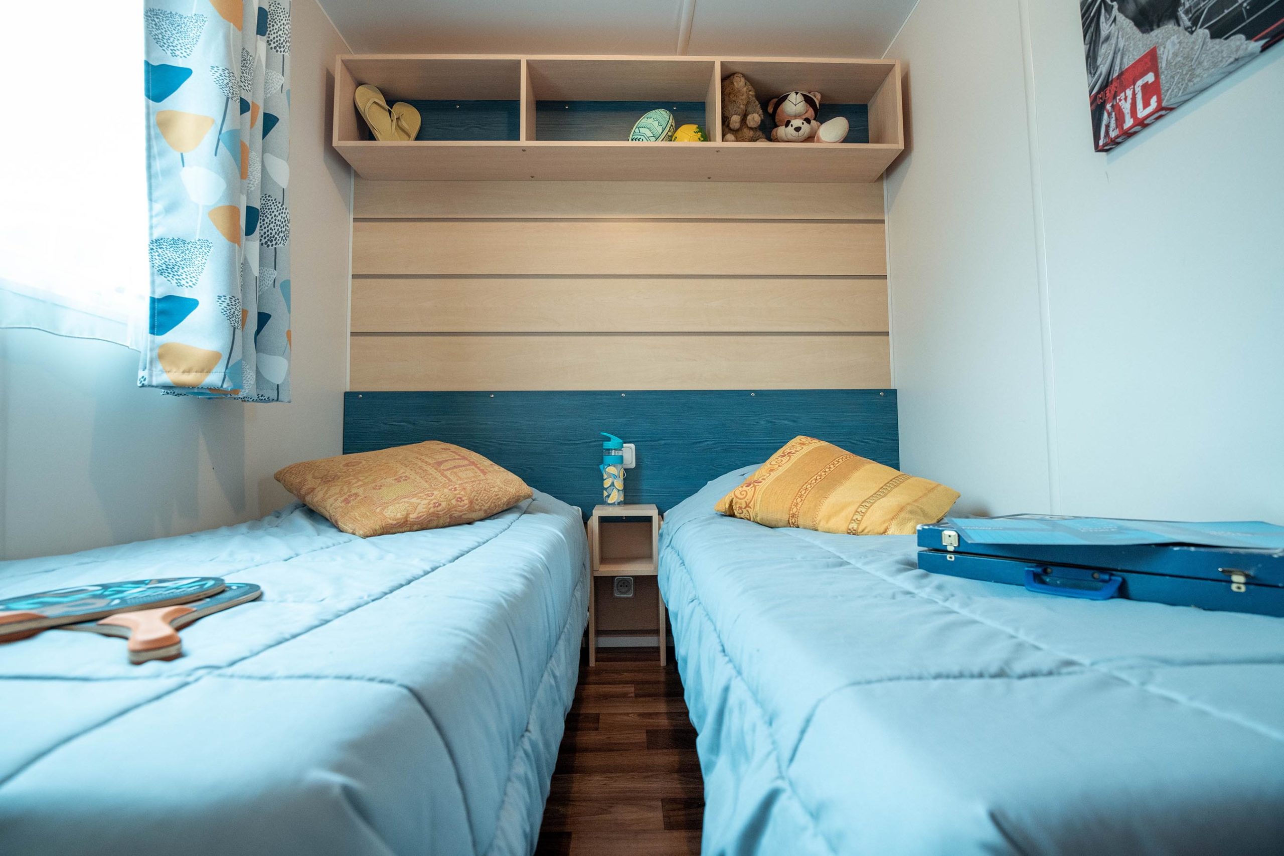 Terrasse couverte – Chambre parentale avec emplacement pour lit bébé (selon modèle, à préciser à la réservation). Les draps ne sont pas inclus.  En week-end ? Pensez à ajouter l’option « kit draps ».